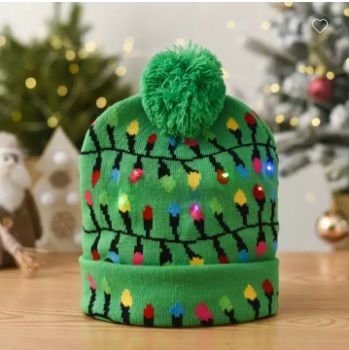 Caciula verde cu leduri , cu buton de selectie :leduri stinse , leduri aprinse si 2 jocuri diferite de lumini.